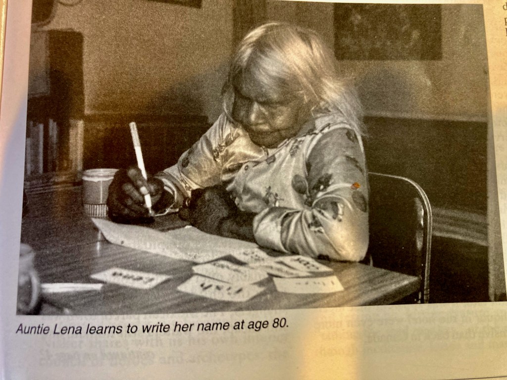 Yet years later, when we met Auntie Lena, she maintained a centeredness, a sense of humour, a non-judgemental attitude, and an ability to reach out in the midst of all the chaos of the disrupted society, I remember her delighted laughter and dry comments, as she sat on a broken chair in a yard glittering with bits of broken glass. She was one of the elders who put together a book and went into the schools to teach Ngiyampaa language and culture to the children, both black and white. It took a lot of courage and self-respect to go into the school when she had never learned to read and write. Later she asked me to teach her. I have a wonderful photograph of her learning to write her name at age 80, something she had yearned to do for 60 years.