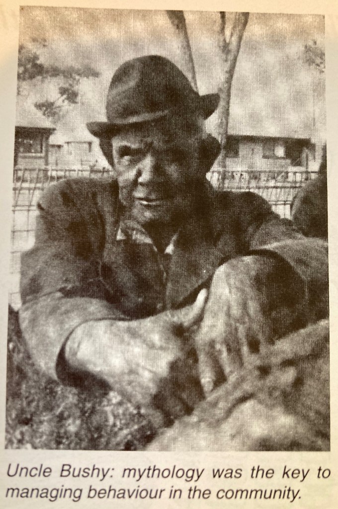 Uncle Bushy understood at some level that mythology was the key to managing behaviour in the community. He invented the Black Superman, a terrifying creature who lurked in the bushes. It made sense to the kids, because it bridged the mythology of modern life they got from television and their own sense of natural limits. Bushy told the kids that if they went out after dark down near the river, the Black Superman was going to get them. It worked wonderfully. Kids would come over to visit and we’d have to walk them home after dark because no kid was going to go out where the Black Superman might get them. For that aboriginal community, the Black Superman story became part of the Law, a story about life which shaped the way people behaved.